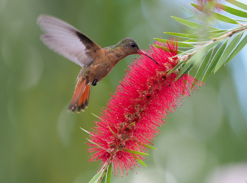 Cinnamon Hummingbird er en vidt udbredt art, som især træffes i tørre og halvtørre zoner mange steder i Mellemamerika. Denne fouragerende fugl er fra en hotelhave i Ocotal i departementet Nueva Segovia i det nordlige Nicaragua.