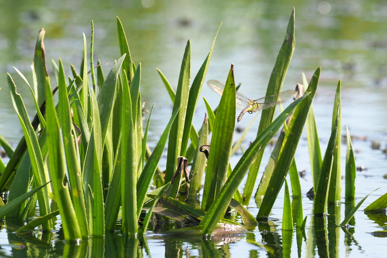 Æglæggende hun af Grøn Mosaikguldsmed i bevoksning af krebseklo, Tømmerby Ringkanal ved Tømmerby Fjord.